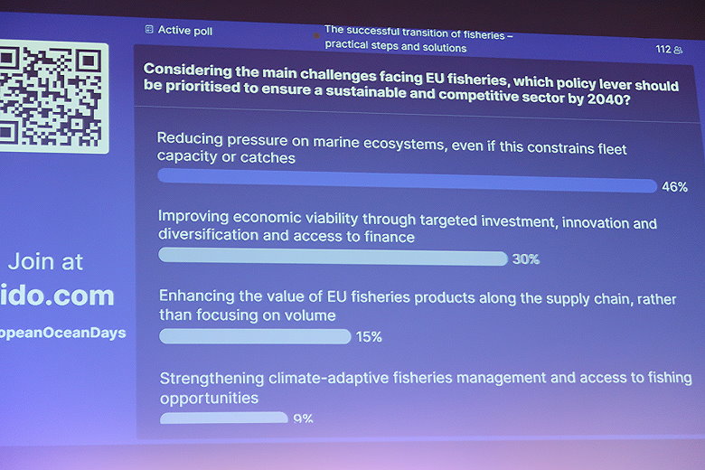 During the second panel of this session, Javier Garat as president of EUROPECHE, the industrial lobby organisation, frontally attacked Charlena Vitcheva’s presentation demanding to scrap fisheries controls and environmental regulations. He instead advocated the funding of an action plan for blue food, more subsidies for the fleet owners. That was clearly not shared by the public as shown in the slido poll above. Interestingly, in a later panel discussing coastal and island communities on 6 March, where he represented the European Economic and Social Committee (EESC) as a member and rapporteur for the European Ocean Act, he lamented the great damage inflicted to his home town near Cadiz in Andalusia by three consecutive cyclones. That is, of course, a big hardship for the people and communities affected, who need solidarity and help.