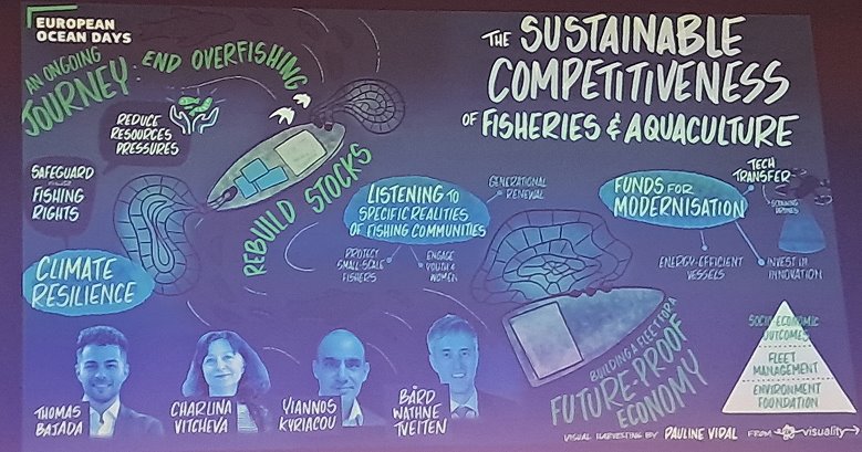 The afternoon session on Wednesday, 4 March, was dedicated towards a 2040 vision for thriving fisheries and aquaculture. It was introduced by Commissioner for Fisheries and Oceans, Costas Kadis, who reminded the participants of the importance of consumer trust, the resilience of supply, good labour conditions, and a regulatory and financial tool kit fit for purpose. The following high-level panel passionately argued to act on declining production with rebuilding stocks to make fisheries attractive for young people. Charlena Vitcheva, Director General of DG MARE recalled that the last reform leading to the current Common Fisheries Policy (CFP) mandated management to maintain stocks at levels above the maximum sustainable yield (MSY). Current fishing pressures needed to be reduced to avoid further reduction of the biomass in the water and loss of profitability. While there was a need to adapt measures to regional conditions, it was important to ensure the profitability of the professions to ensure generational renewal.