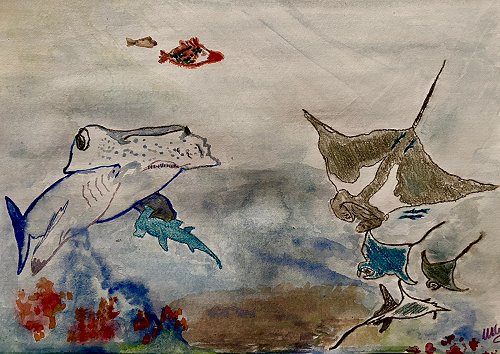 A: I think art in all its forms is always a powerful communication tool. What we are notu able to communicate through a scientific paper maybe is easier to be delivered through a drawing, a sculpture or a song. To be honest the booklet was born during my Christmas break. I started with a watercolour on the whale shark encounter (which was at the top of my bucket list for this expedition), then I ended up with a dozen of them, highlighting all the key encounters of the field expedition. Therefore, I decided to merge some pictures with the watercolours series and to write a short story to share this experience with those interested in hearing about that. I thought of kids and high school teens as my main target audience, but I think it is suitable also for divers or other adults.