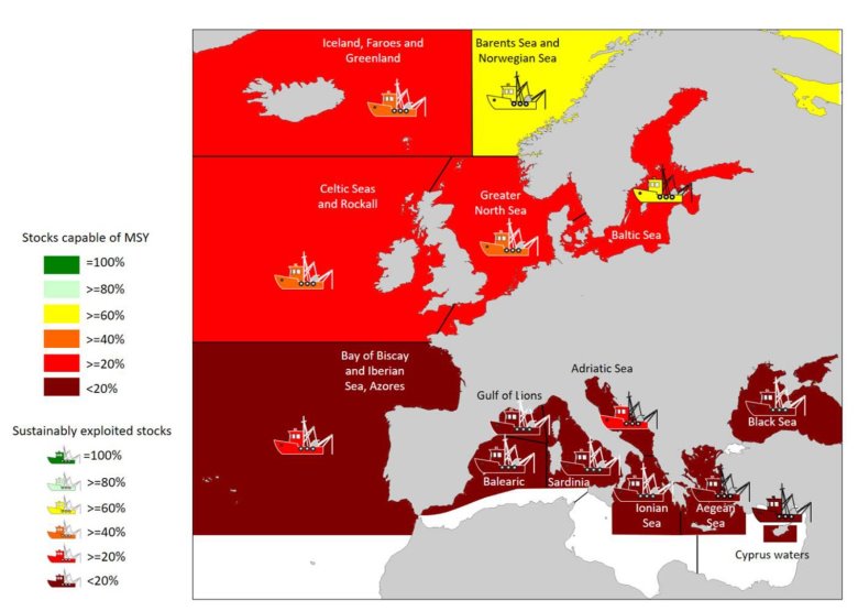 This had curtailed European fisheries catches from a potential of more than 10 million tons produced under maximum sustainable yield (MSY) scenarios estimated in 2016 when just over 5 millions tons were recorded. Overcapacity and political expediency allocating excessive quota to industrial vessels led to a steady downward trend.